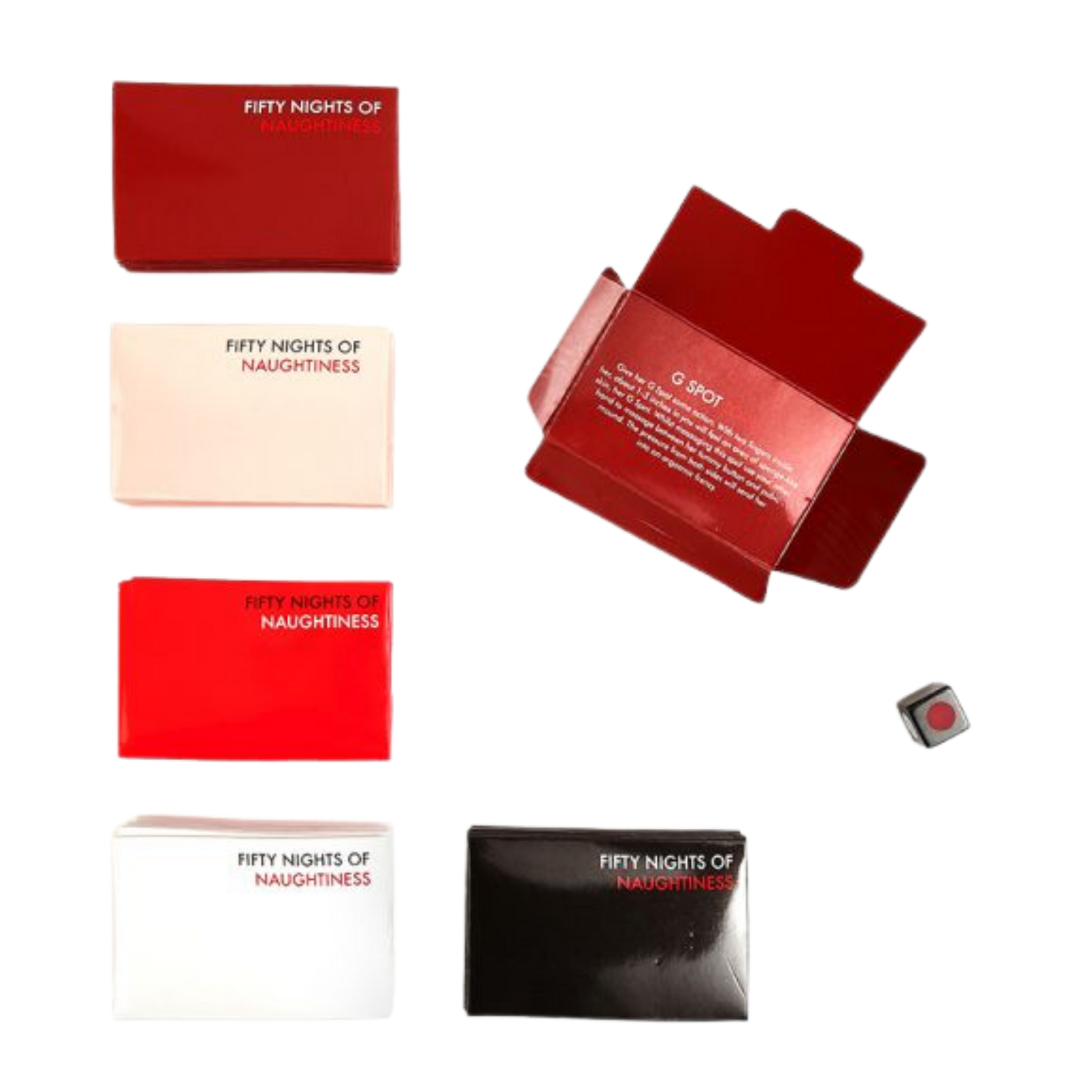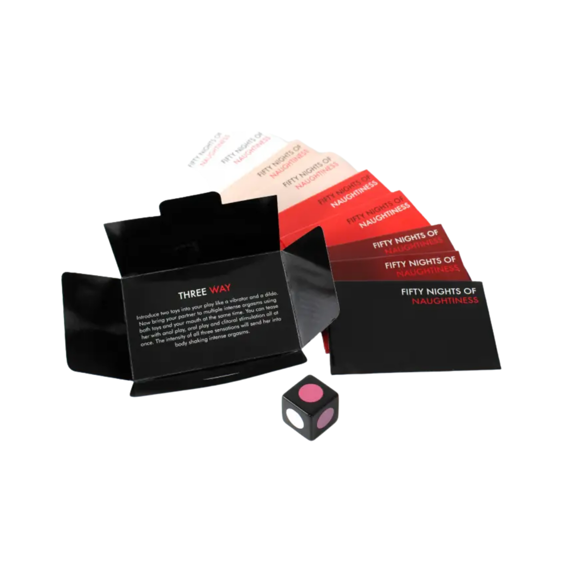 Spice up your intimate moments with Fifty Nights of Naughtiness, a flirty couples' game designed to push boundaries and ignite passion. This playful deck features 50 colorful invitation cards—from innocent to daring—that guide you through escalating challenges and role-play scenarios. Roll the die to select your envelope, then discover what adventure awaits. Perfect for couples ready to explore new dynamics together, whether you're keeping things light or diving into deeper territory. Each card sets the scene for unforgettable nights of connection and excitement.
